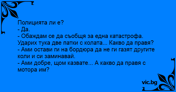 - Обаждам се да съобщя за една катастрофа. Ударих тука две патки с колата... Какво да правя?