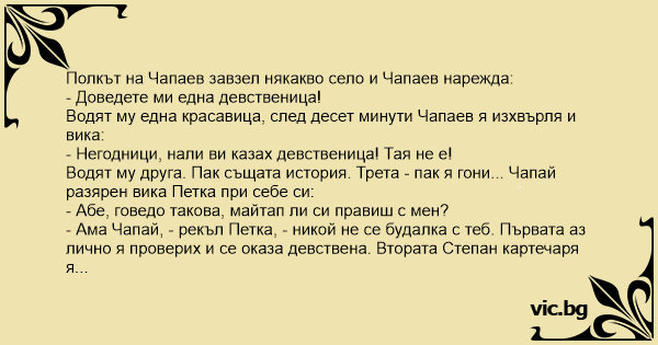 - Ама Чапай, - рекъл Петка, - никой не се будалка с теб. Първата аз лично я проверих и се оказа девствена. Втората Степан картечаря я провери, а третата двамата заедно я проверихме за всеки случай. Бива ли така - да ни нямаш вяра?
