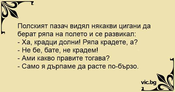 Полският пазач видял някакви цигани да берат ряпа на полето и се развикал: