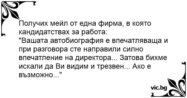 "Вашата автобиография е впечатляваща и при разговора сте направили силно впечатление на директора... Затова бихме искали да Ви видим и трезвен... Ако е възможно..."