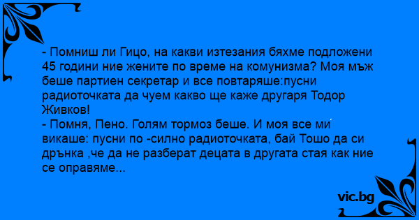 - Помниш ли Гицо, на какви изтезания бяхме подложени 45 години ние жените по време на комунизма? Моя мъж беше партиен секретар и все повтаряше:пусни радиоточката да чуем какво ще каже другаря Тодор Живков!
