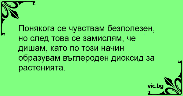 Понякога се чувствам безполезен, но след това се замислям, че дишам, като по този начин образувам въглероден диоксид за растенията.