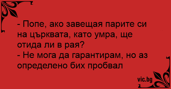 - Попе, ако завещая парите си на църквата, като умра, ще отида ли в рая?