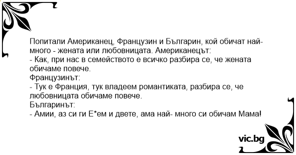 Попитали Американец, Французин и Българин, кой обичат най-много - жената или любовницата. Американецът:
