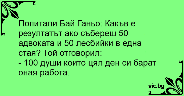Попитали Бай Ганьо: Какъв е резултатът ако събереш 50 адвоката и 50 лecбийkи в една стая? Той отговорил: