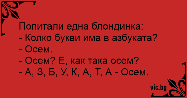 На испит: - Колега,колку букви има азбуката? - 6 букви! - Како бе 6? - Па А З Б У К А, 6 букви!