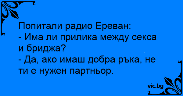 Разговараат двајца пријатели: - Сексот е исто како бриџ. - ??? - Ако немаш добар партнер, тогаш подобро е да имаш добра рака.