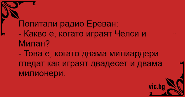 - Kas tas ir, kad spēlē “Čelsija” un “Milāna”? - Divi miljardieri skatās, kā spēlē divdesmit divi miljonāri.