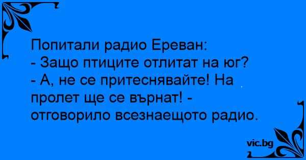 - А, не се притеснявайте! На пролет ще се върнат! - отговорило всезнаещото радио.