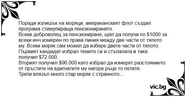 Трети влязъл много стар моряк с странното желание да измерят разстоянието от върха на пeниca до топките му. И понеже другите кандидати взели много пари, от комисията се пробвали да го разубедят, но моряка си настоявал на неговото. И така, военният лекар казал на моряка да си свали гащите, сложил метъра на върха на пeниca на моряка, продължил назад и внезапно извикал: