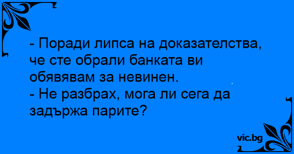 Richter: "Ich spreche Sie hiermit frei von der Anklage, sie hätten die 10.000 Euro gestohlen." Angeklagter: "Prima. Darf ich das Geld dann behalten?"
