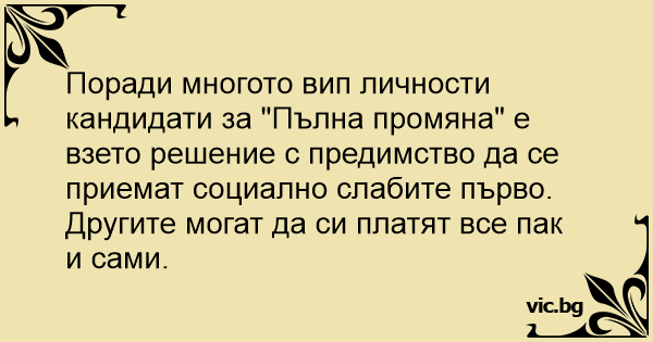 Поради многото вип личности кандидати за "Пълна промяна" е взето решение с предимство да се приемат социално слабите първо.