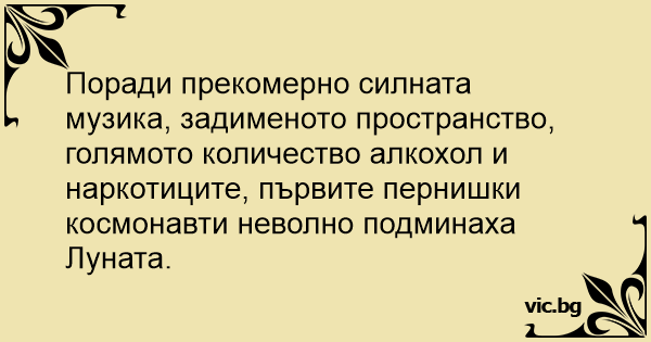 Поради прекомерно силната музика, задименото пространство, голямото количество алкохол и наркотиците, първите пернишки космонавти неволно подминаха Луната.