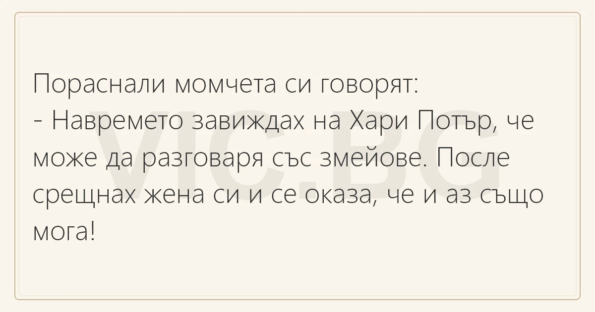 Пораснали момчета си говорят: - Навремето завиждах на Хари Потър, че може да разговаря със змейове. После срещнах жена си и се оказа, че и аз също мога! English Deutsch Español Русский Français Italiano Ελληνικά Македонски Türkçe Українська Português Polski Svenska Nederlands Dansk Norsk Suomi Magyar Româna Čeština Lietuvių Latviešu Hrvatski