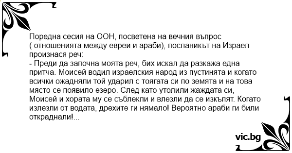- Преди да започна моята реч, бих искал да разкажа една притча. Моисей водил израелския народ из пустинята и когато всички ожадняли той ударил с тоягата си по земята и на това място се появило езеро. След като утолили жаждата си, Моисей и хората му се съблекли и влезли да се изкъпят. Когато излезли от водата, дрехите ги нямало! Вероятно араби ги били откраднали!