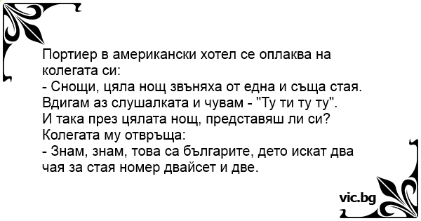 - Снощи, цяла нощ звъняха от една и съща стая. Вдигам аз слушалката и чувам - "Ту ти ту ту".