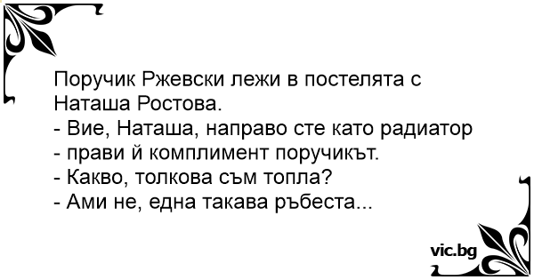 - Вие, Hаташа, направо сте като радиатор - прави й комплимент поручикът.