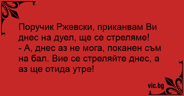 Поручик Ржевски, приканвам Ви днес на дуел, ще се стреляме!