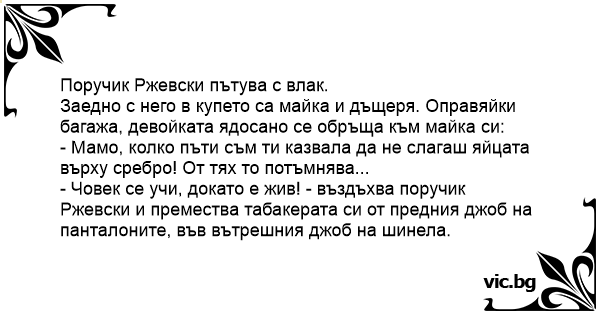 - Човек се учи, докато е жив! - въздъхва поручик Ржевски и премества табакерата си от предния джоб на панталоните, във вътрешния джоб на шинела.