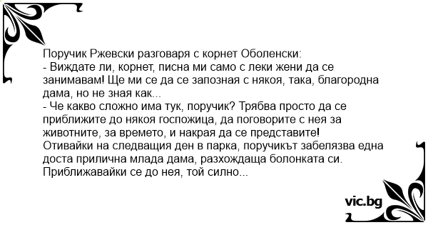- Че какво сложно има тук, поручик? Трябва просто да се приближите до някоя госпожица, да поговорите с нея за животните, за времето, и накрая да се представите!