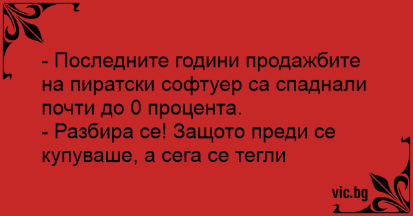 - Последните години продажбите на пиратски софтуер са спаднали почти до 0 процента.