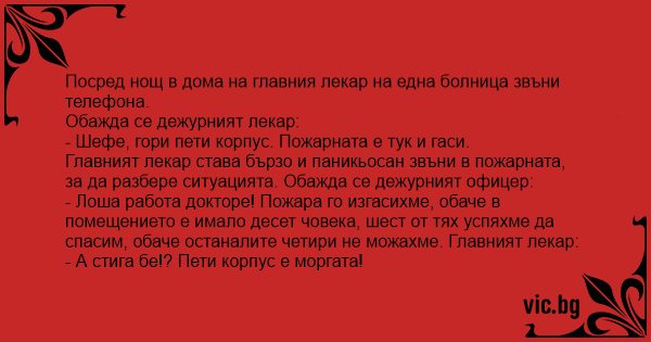 Главният лекар става бързо и паникьосан звъни в пожарната, за да разбере ситуацията. Обажда се дежурният офицер:
