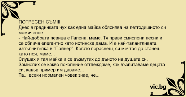 - Най-добрата певица е Галена, маме. Тя прави смислени песни и се облича елегантно като истинска дама. И е най-талантливата изпълнителка в "Пайнер". Когато пораснеш, си мечтая да станеш като нея, маме...