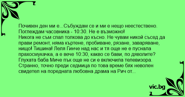 Никога не съм спал толкова до късно. Не чувам никой съсед да прави ремонт, няма къртене, пробиване, рязане, заваряване, нищо! Тишина! Леля Гинче над нас и тя още не е пуснала прахосмукачка, а е вече 10:30, какво се бави, по дяволите? Глухата баба Миче пък още не си е включила телевизора. Странно, точно преди седмица по това време бях неволен свидетел на поредната любовна драма на Рич от "Дързост и Красота". А сега е тихо, ненормално тихо. Единственият звук, който достига до мен е някакво далечно лежерно гугукане. Давам си сметка, колко прекрасно може да е едно утро, ако те оставят да се наспиш. Протягам се сладко-сладко в леглото и се обръщам на другата страна да си доспя в царството на тишината, когато някой някъде се изкрясква: