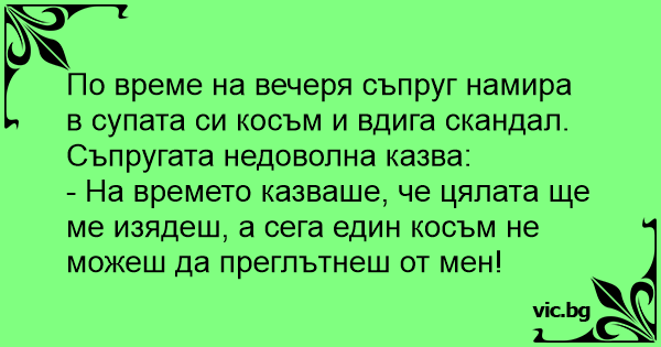 По време на вечеря съпруг намира в супата си косъм и вдига скандал. Съпругата недоволна казва: