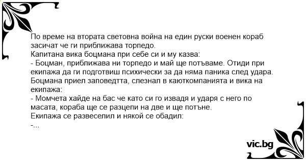 - Боцман, приближава ни торпедо и май ще потъваме. Отиди при екипажа да ги подготвиш психически за да няма паника след удара.