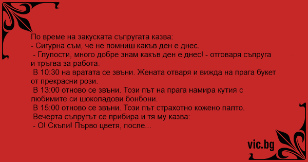 - Глупости, много добре знам какъв ден е днес! - отговаря съпруга и тръгва за работа.