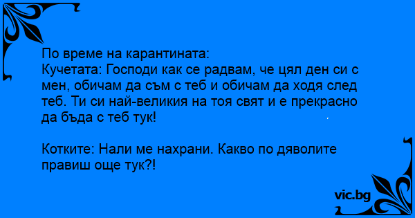 По време на карантината:<br />Кучетата: Господи как се радвам, че цял ден си с мен, обичам да съм с теб и обичам да ходя след теб. Ти си най-великия на тоя свят и е прекрасно да бъда с теб тук!<br /><br />Котките: Нали ме нахрани. Какво по дяволите правиш още тук?!