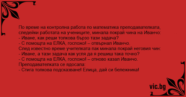 По време на контролна работа по математика преподавателката, следейки работата на учениците, минала покрай чина на Иванчо:
