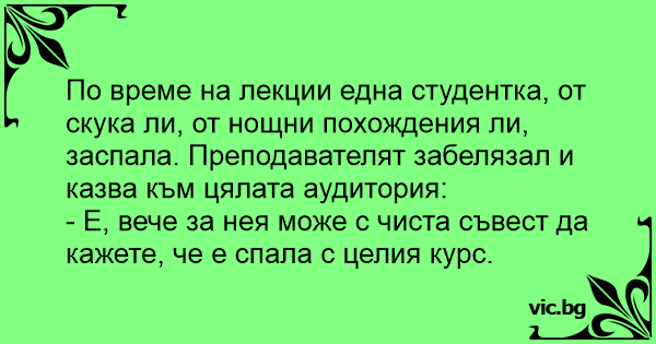 По време на лекции една студентка, от скука ли, от нощни похождения ли, заспала. Преподавателят забелязал и казва към цялата аудитория: