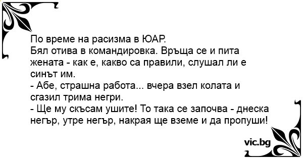 - Абе, страшна работа... вчера взел колата и сгазил трима негри.