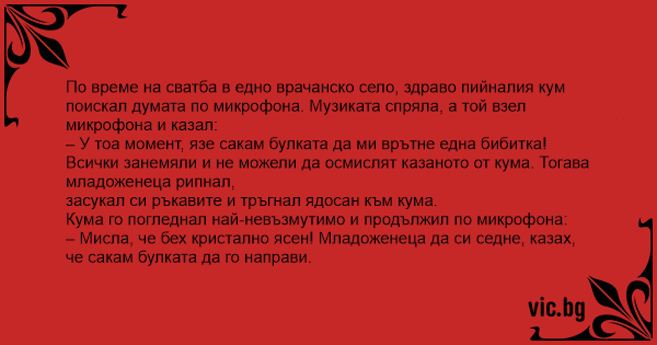 По време на сватба в едно врачанско село, здраво пийналия кум поискал думата по микрофона. Музиката спряла, а той взел микрофона и казал: