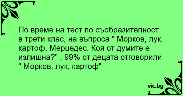 По време на тест по съобразителност в трети клас, на въпроса " Морков, лук, картоф, Мерцедес. Коя от думите е излишна?" , 99% от децата отговорили " Морков, лук, картоф"