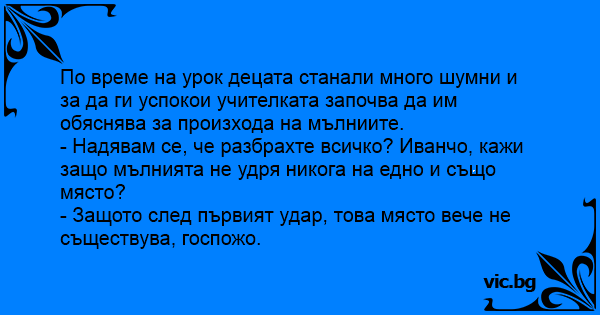 - Надявам се, че разбрахте всичко? Иванчо, кажи защо мълнията не удря никога на едно и също място?