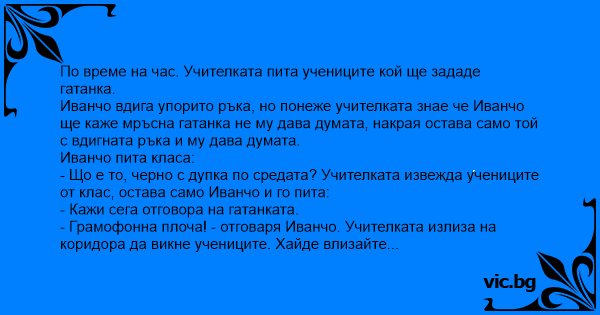 - Грамофонна плоча! - отговаря Иванчо. Учителката излиза на коридора да викне учениците. Хайде влизайте ученици в клас НЕ е пуtka, плоча е!