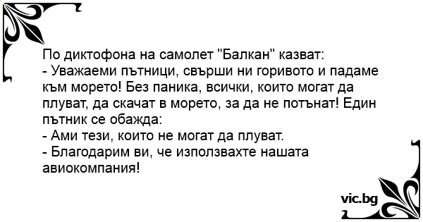 - Уважаеми пътници, свърши ни горивото и падаме към морето! Без паника, всички, които могат да плуват, да скачат в морето, за да не потънат! Един пътник се обажда: