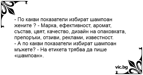 - А по какви показатели избират шампоан мъжете? - На етикета трябва да пише «шампоан».