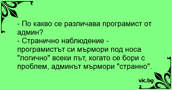 - Странично наблюдение - програмистът си мърмори под носа "логично" всеки път, когато се бори с проблем, админът мърмори "странно".