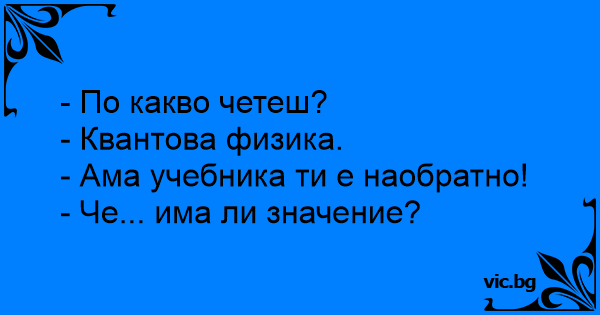 Divi studenti pirms eksāmena sēž gaitenī un gaida savu ekzekūciju. - Ko lasi? - Kvantu fiziku. - Kāpēc grāmata ar kājām gaisā? - Kāda gan tam atšķirība...