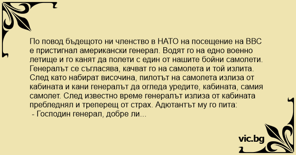 По повод бъдещото ни членство в НАТО на посещение на ВВС е пристигнал американски генерал. Водят го на едно военно летище и го канят да полети с един от нашите бойни самолети. Генералът се съгласява, качват го на самолета и той излита. След като набират височина, пилотът на самолета излиза от кабината и кани генералът да огледа уредите, кабината, самия самолет. След известно време генералът излиза от кабината пребледнял и треперещ от страх. Адютантът му го пита: