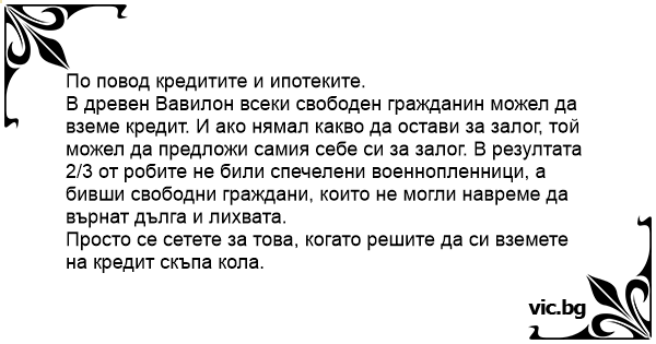 В древен Вавилон всеки свободен гражданин можел да вземе кредит. И ако нямал какво да остави за залог, той можел да предложи самия себе си за залог. В резултата 2/3 от робите не били спечелени военнопленници, а бивши свободни граждани, които не могли навреме да върнат дълга и лихвата.