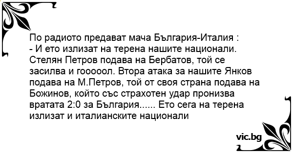 - И ето излизат на терена нашите национали. Стелян Петров подава на Бербатов, той се засилва и гооооол. Втора атака за нашите Янков подава на М.Петров, той от своя страна подава на Божинов, който със страхотен удар пронизва вратата 2:0 за България...... Ето сега на терена излизат и италианските национали
