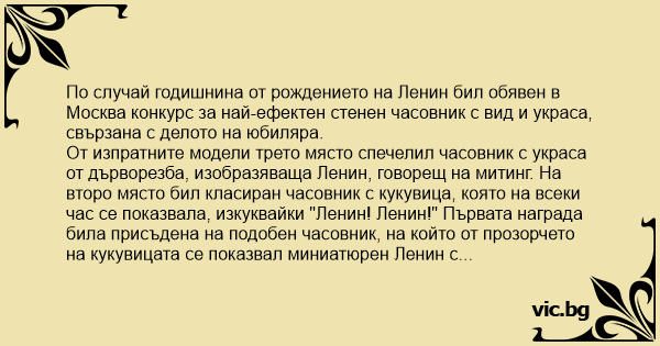 По случай годишнина от рождението на Ленин бил обявен в Москва конкурс за най-ефектен стенен часовник с вид и украса, свързана с делото на юбиляра.