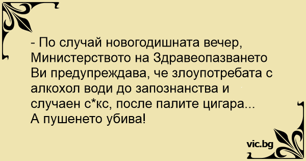 - По случай новогодишната вечер, Министерството на Здравеопазването Ви предупреждава, че злоупотребата с алкохол води до запознанства и случаен cekc, после палите цигара...