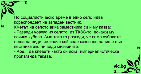 - Разведи човека из селото, из ТКЗС-то, покажи му всичко хубаво. Ама така го разходи, че само хубавите неща да види, че иначе кой знае какво ще напише във вестника ако ни види мизериите.