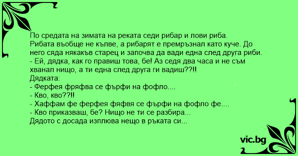 - Ей, дядка, как го правиш това, бе! Аз седя два часа и не съм хванал нищо, а ти една след друга ги вадиш??!!